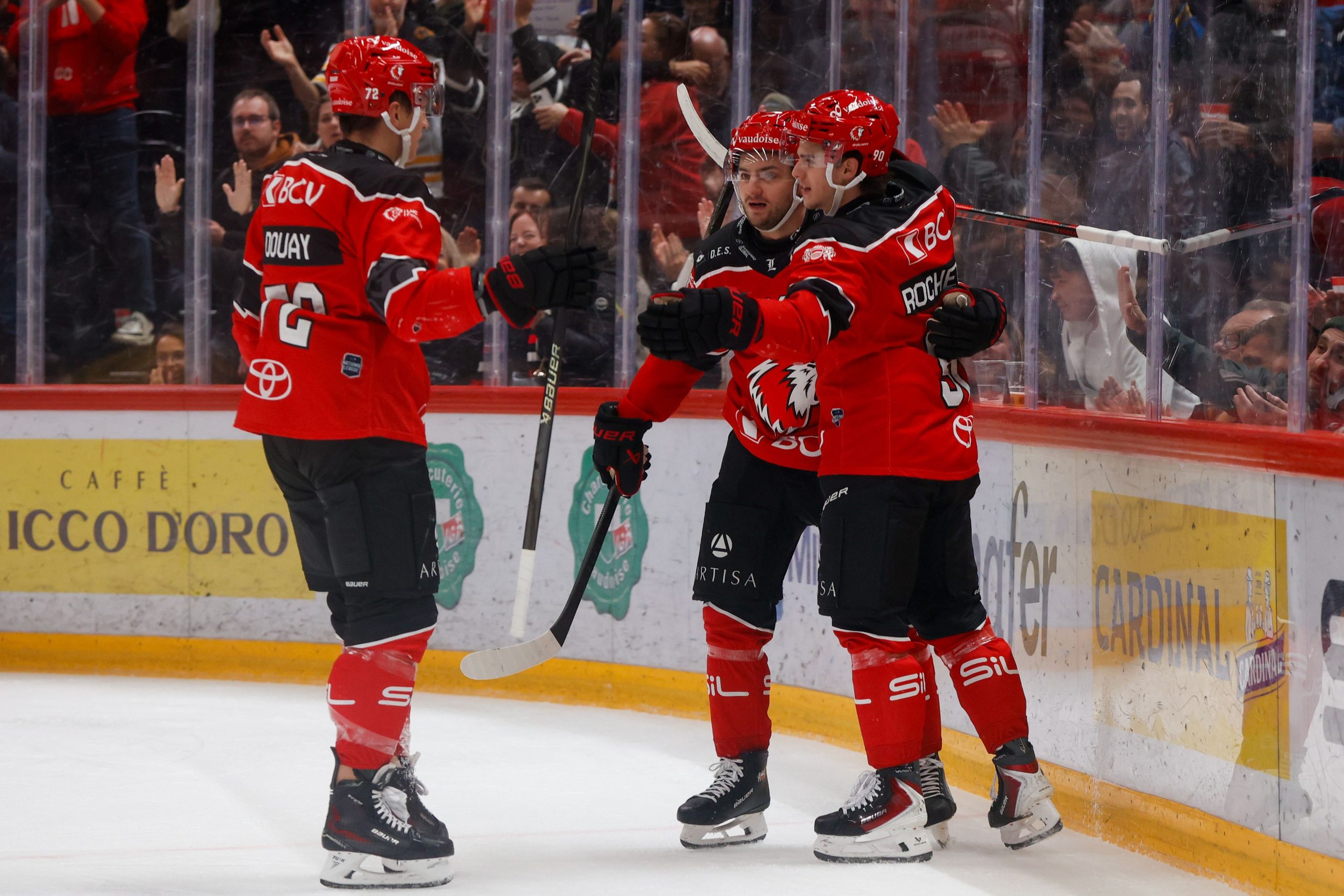 29.10.2025; Lausanne; Eishockey National League; Lausanne HC - HC Davos; Theo Rochette (Lausanne) jubelt mit Erik Braennstroem (Lausanne) und Floran Douay (Lausanne) nach dem 1:1 (Estelle Vagne/freshfocus) ----------------------------------------------------------