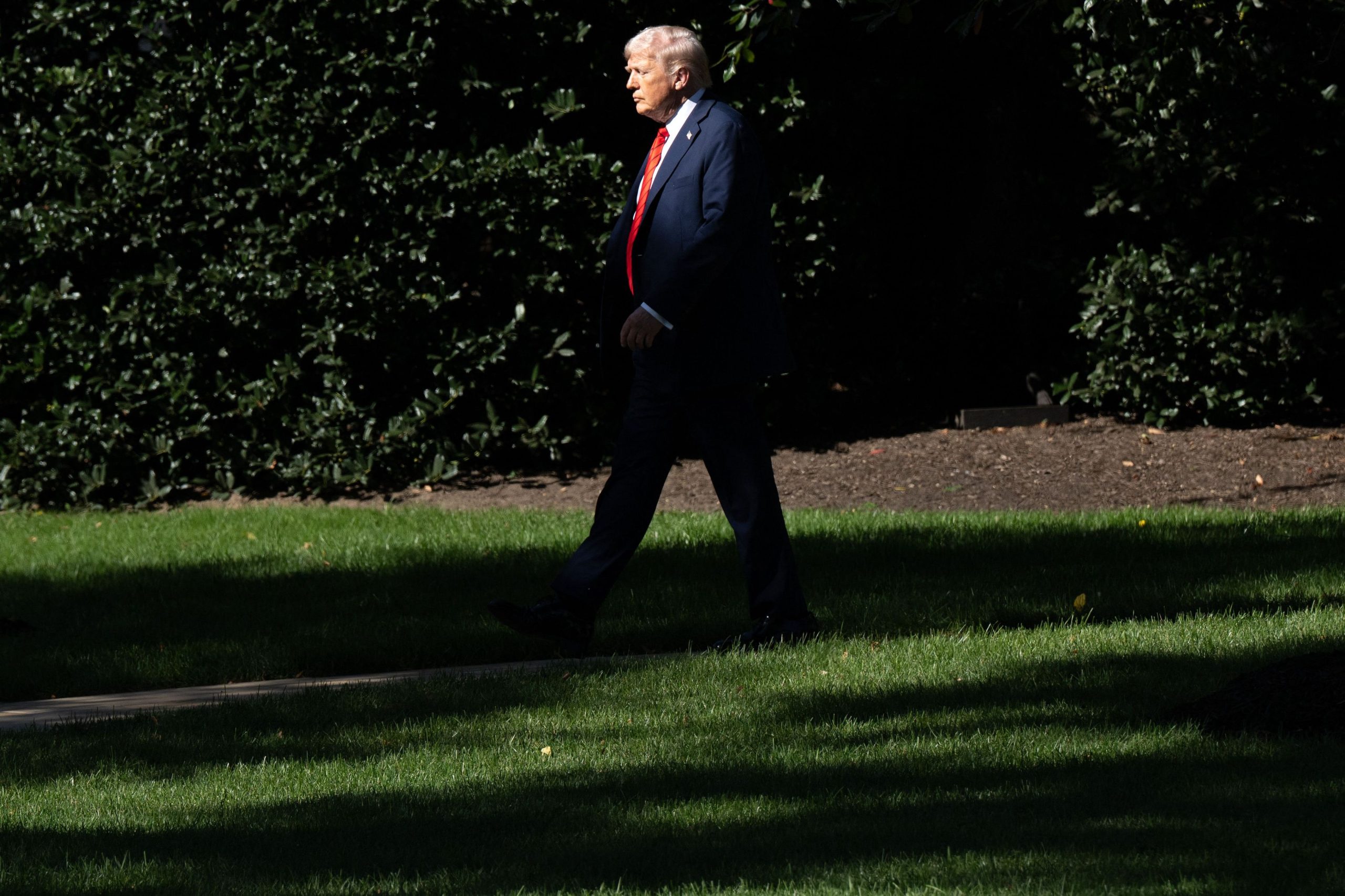 US President Donald Trump walks to Marine One on the South Lawn of the White House in Washington, DC, on October 10, 2025, on his way to Walter Reed National Military Medical Center to receive a medical checkup. (Photo by SAUL LOEB / AFP)